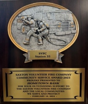 On February 11, 2024, Hometown Bank was awarded the Community Service Award at the Saxton Fire Company Banquet for their outstanding support of to the fire department.